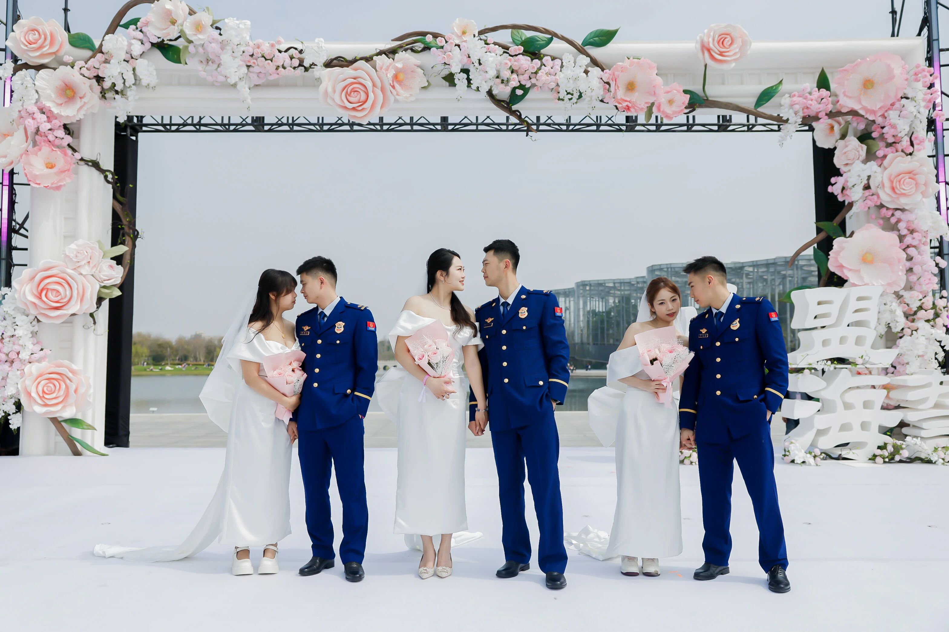 婚礼开始前,新人陆续到场。四位身着湛蓝制服的上海消防总队浦东支队世博大队的消防员在人群中格外显眼,他们携手爱人选择在这里开启人生新篇章。一对来自杭州的新人身上挂满可爱的娃娃,他们表示,集体婚礼形式新颖,更适合年轻人参与。