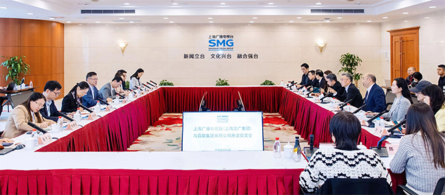 会上,双方围绕相关重点合作项目进行了深入探讨。会前,百联集团有限公司一行参观了上视大堂新媒体平台和智慧广电展示区、第一财经演播室以及东方卫视4K超高清新闻演播室,详细了解上海广播电视台(集团)“智能化、超清化、移动化”建设情况及四个主要新媒体产品运营发展情况。