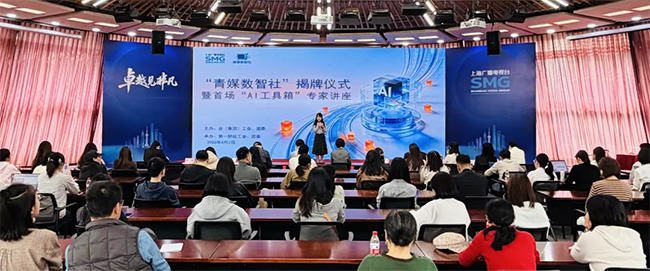 4月2日下午,上视大厦9楼阳光厅内气氛热烈。由上海广播电视台(上海文广集团)工会、团委主办,第一财经工会、团委承办的“青媒数智社”揭牌仪式暨首场“AI工具箱”专家讲座正在这里举行。