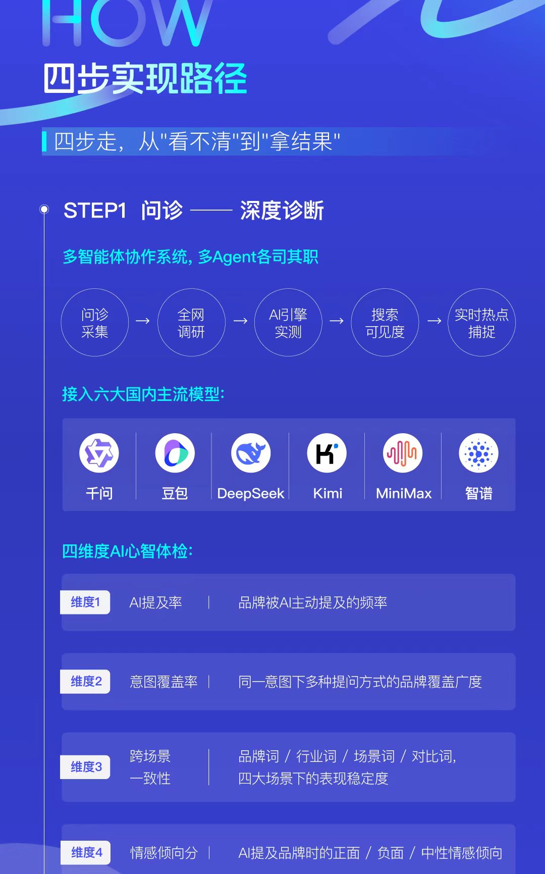 产品以“诊断-咨询-执行-监测”全闭环为核心架构,同时接入千问、豆包、DeepSeek、Kimi等六大国内主流AI大模型,围绕品牌在AI搜索场景中的可见度、健康度与推荐权重,为品牌决策者提供从“看清现状”到“拿到结果”的一站式心智管理方案。