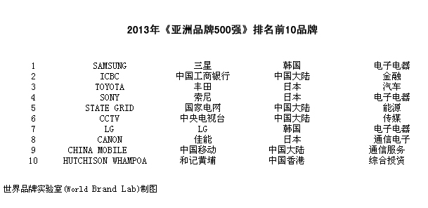 今年是世界品牌实验室第八次对亚洲品牌的影响力进行测评,共有19个国家和地区的500个品牌入选,韩国三星、中国工商银行和日本丰田名列前三,中国、日本和韩国是入选品牌最多的三个国家。