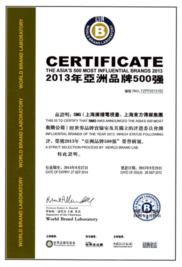 由世界品牌实验室和世界经理人集团共同编制和发布的2013年《亚洲品牌500强》排行榜于9月28日在香港揭晓,SMG(上海广播电视台、上海东方传媒集团有限公司)跻身第162位,同时位列亚洲电视10强品牌。CCTV(中央电视台)、NHK(日本放送协会)和TVB(香港无线电视台)分别位列亚洲电视10强品牌前3位。