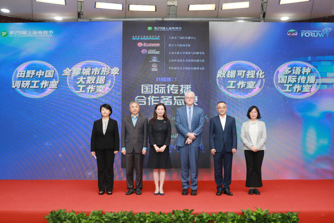 上海文广国际传播中心与复旦、交大、上外、华师大等四所顶尖高校共同签订合作备忘录,揭幕数据可视化工作室、全球城市形象大数据工作室、多语种国际传播工作室和田野中国调研工作室,携手搭建国际传播多元实践平台。
