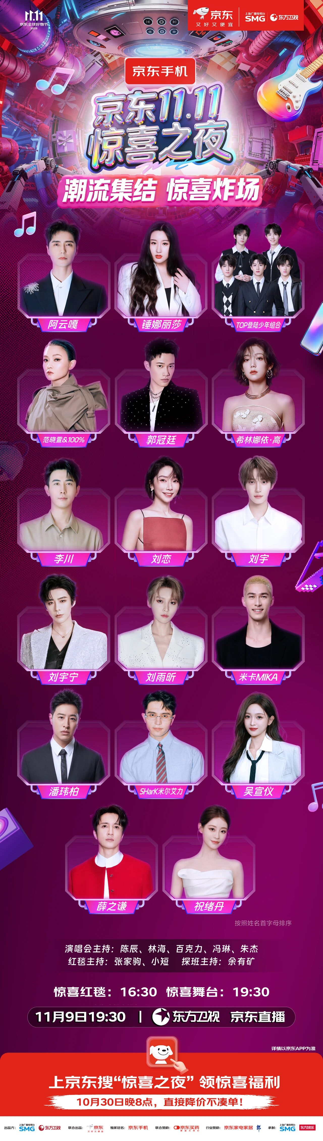 继前两轮艺人阵容陆续揭晓后,本周《京东11.11惊喜之夜》再掀高潮,迎来多位重量级嘉宾。不仅有凭借音乐剧舞台圈粉无数的阿云嘎、从甜歌天后转型个性音乐人的范晓萱、声线极具叙事感的全能型原创音乐人郭冠廷,华语说唱领域“元老级”歌手潘玮柏,以及搞笑与深情兼具的创作型唱将薛之谦重磅加盟,用舞台诠释音乐魅力,还有“鬼马精灵”祝绪丹惊喜助阵为大家带来欢乐舞台。他们将用歌喉与表演唤醒大众青春记忆,凭独特台风点燃全场热情,将现场气氛推向高潮。