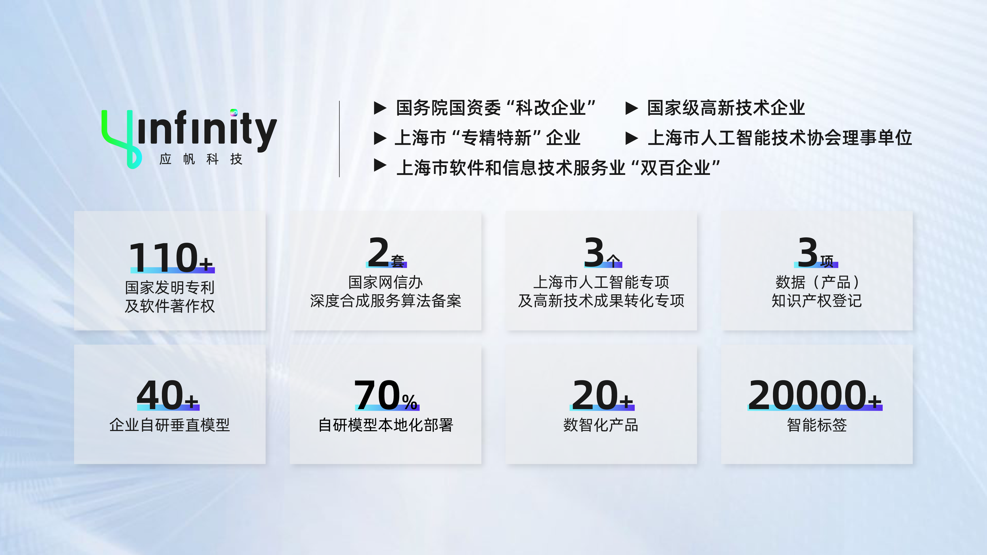 目前,应帆科技已围绕数据要素和人工智能技术构建起多维服务模型,拥有40余套企业自研垂直模型,其中近70%实现本地化部署,获得百余项国家发明专利和软件著作权,研发出20余套数智化产品,完成3项数据(产品)知识产权登记,并承接多个上海市高新技术成果转化项目。