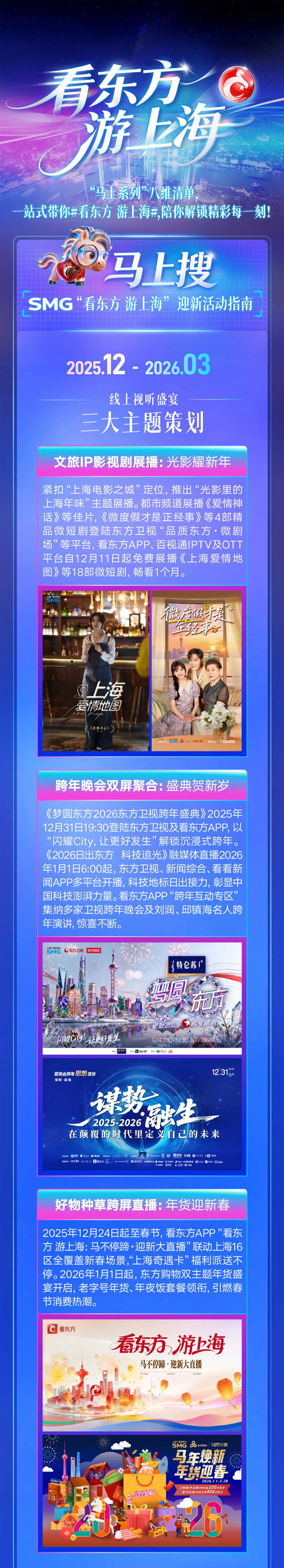 活动依托移动端主平台“看东方”APP,承接线上线下全域流量,聚合直播、回放、花絮、攻略等全维度内容,打造消费综合入口,为市民游客提供一站式节庆消费解决方案。届时将贯穿2026年五一、暑期、国庆等节假日,形成“全年联动、旺季爆发”的持续活力。