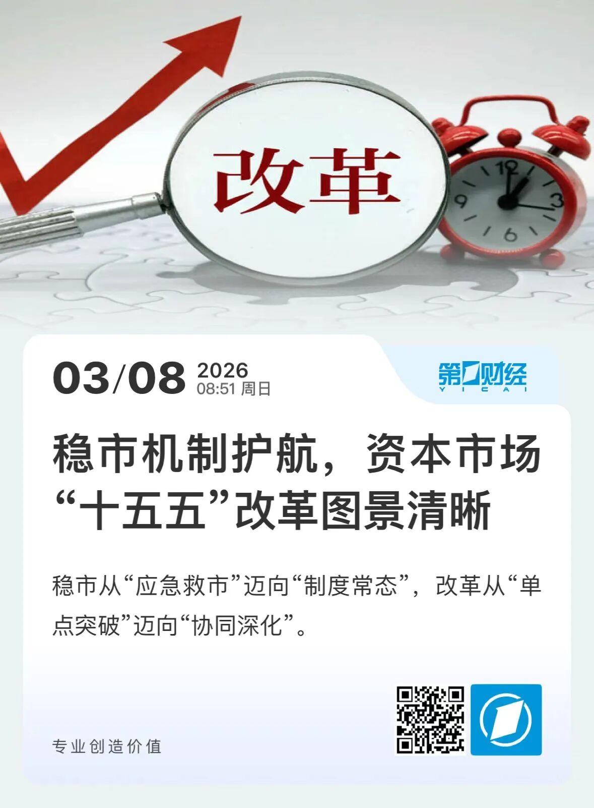第一财经发布《稳市机制护航,资本市场“十五五”改革图景清晰》,为市场清晰勾勒了“十五五”资本市场改革的路线图,为投资者提供清晰政策指引。报道结合政府工作报告、两会经济主题发布会以及“十五五”规划关于资本市场的部署,阐述中国资本市场“十五五”期间的改革图景。报道还通过证监会主席吴清在两会发布会上的表态,系统披露了深化创业板改革、优化再融资机制、健全中长期资金入市等关键政策方向。