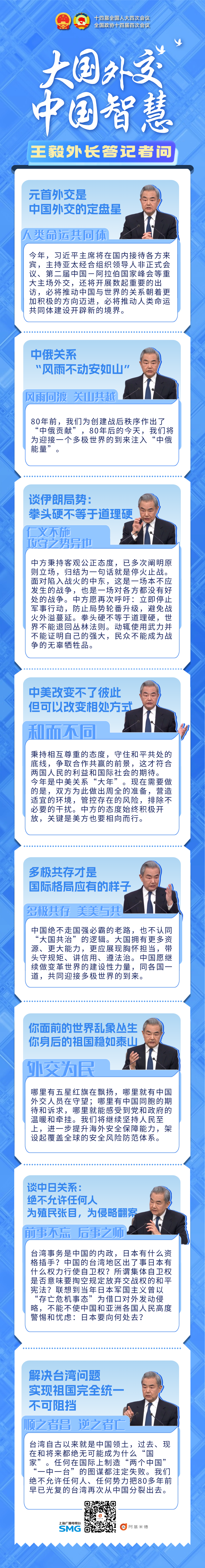 上海人民广播电台新媒体平台阿基米德推出长图海报“大国外交 中国智慧”,聚焦王毅外长记者会核心内容。长图海报将外长发言中的金句与中国特色外交理念深度融合,形成“一个核心议题观点、一段金句展开、一句‘中国外交智慧’提炼”的清晰结构。设计上采用蓝白主色调,搭配权威视觉元素,通过模块化布局提升可读性。内容上将“和而不同”“美美与共”“仁义不施,攻守之势异也”等中国文化表达转化为视觉记忆点,实现政策解读与文化传播的有机统一。