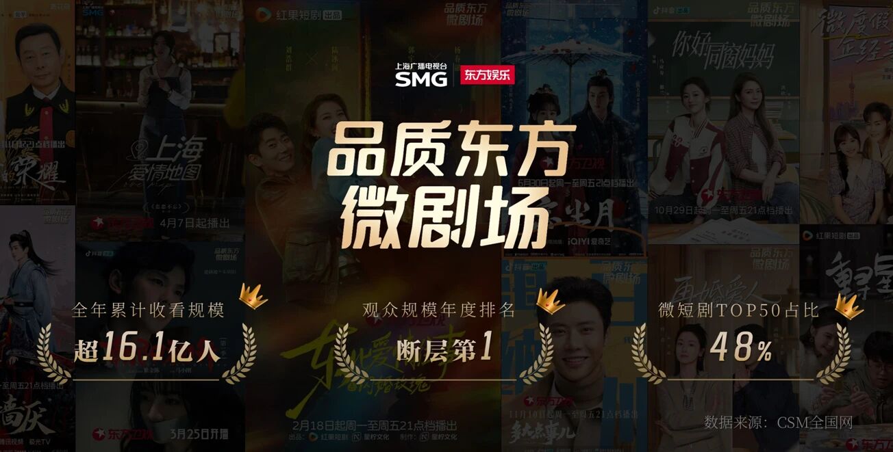 东方卫视率先推出全国首个微短剧精品展播平台——“品质东方·微剧场”,并在黄金时段日播。CSM全国网显示,剧场开播以来累计触达观众16.1亿人次,收视规模稳居全国第一。同时创新打造国内首档“微短剧+”综艺《开播!短剧季》,至今已成功举办两季,成功孵化职场微短剧《我是杜拉拉》。综艺节目全网曝光量超8亿,实现了内容传播与人才培养的双赢。