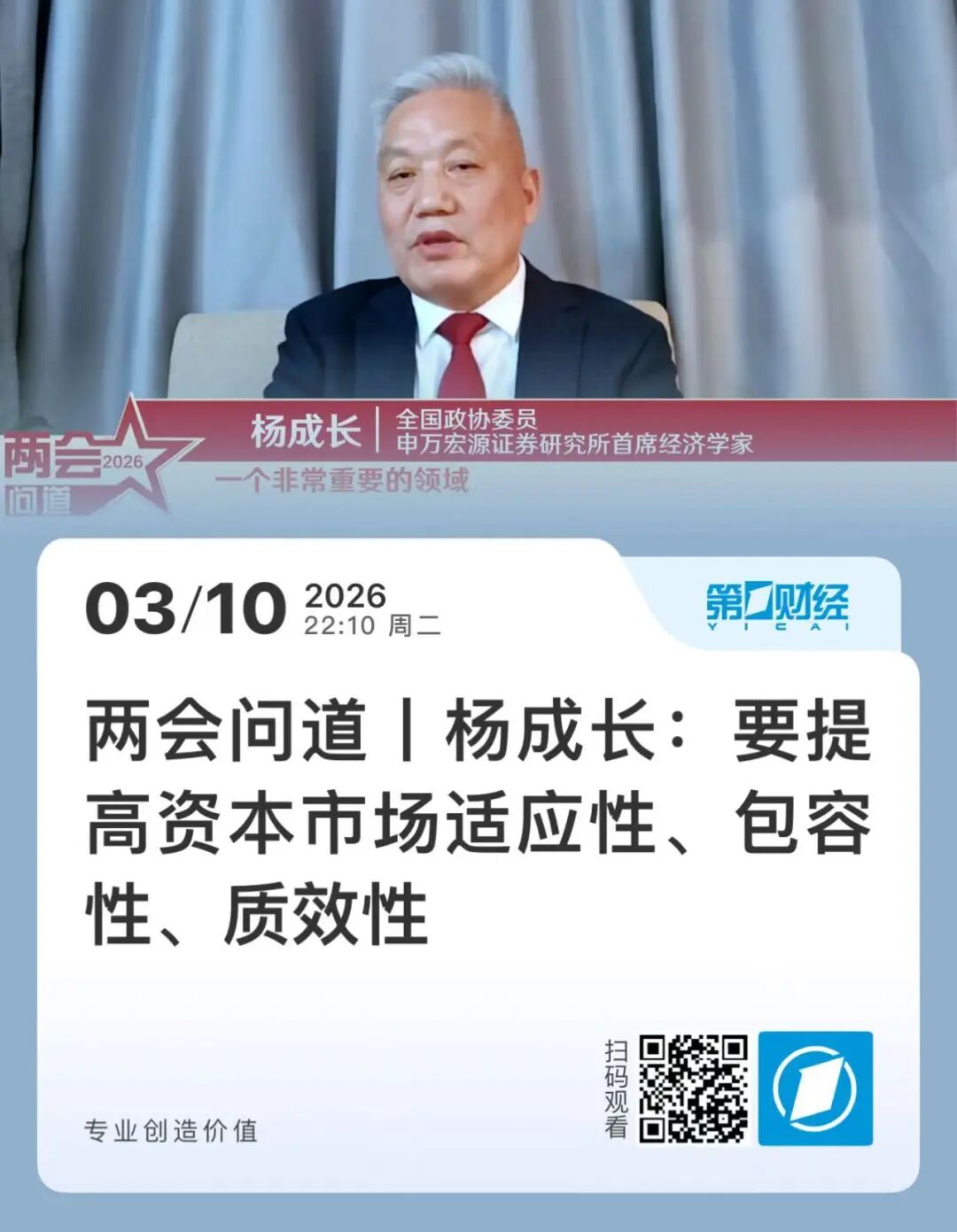 第一财经《两会问道》专栏从3月3日至3月10日,专访了16位全国两会代表委员,以政府工作报告中的关键表述为核心切入点,在科技创新、医疗健康、绿色低碳、AI出海、资本市场改革、农业农村等热门话题方面深度探讨和剖析,将报告中的“硬核”信息转化为通俗易懂、生动直观的视听语言,提升了政策宣传的覆盖面和渗透力,实现了主流声音的有效传播与正向引导。