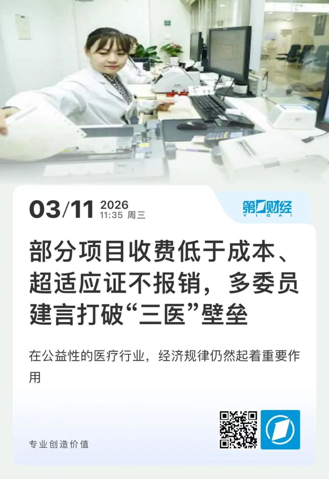 第一财经3月11日发布《部分项目收费低于成本、超适应证不报销,多委员建言打破“三医”壁垒》,为三医协同改革提供具体方向,助力公立医院公益性落地。报道指出,三医协同亟待攻克的最根本问题在于存在激励不尽相容。委员们提出动态调整医疗服务价格、优化CMI值、完善特例单议机制、加强数据利用等具体政策建议,提供了来自实践一线的思考方向。