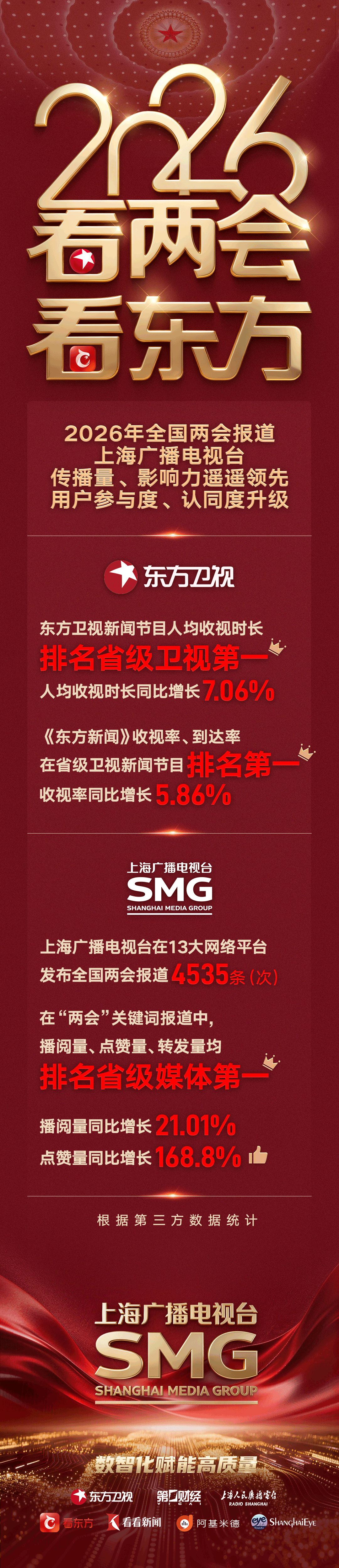 今年全国两会报道,上海广播电视台传播量、影响力遥遥领先,用户参与度、认同度升级。东方卫视新闻节目人均收视时长排名省级卫视第一,同比增长7.06%。《东方新闻》收视率、到达率在省级卫视新闻节目排名第一,收视率同比增长5.86%。